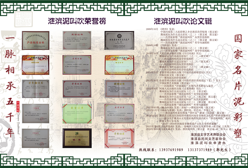 2013年5月, 淮滨泥叫吹《龙凤呈祥》、《比翼双飞》系列作品在河南省第七届民间工艺美术博览会活动中荣获银奖各一枚。