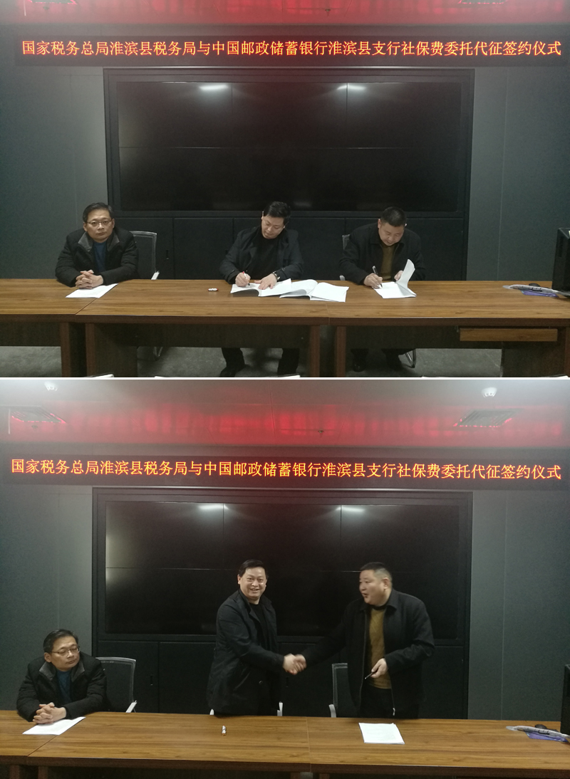 3月6日,县税务局与中国邮政储蓄银行淮滨县举行了社保费委托代征协议签约仪式,进一步拓宽办税缴费服务模式,助力“只跑一次”,提升办税服务质量。