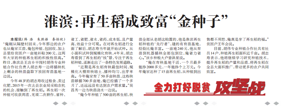“俺在育秧基地干活,一个月最多能挣2000多元,一年能挣个上万元。今年俺家还种了15亩再生稻,从种植到出售都不用愁,俺真是享了再生稻的福。”贫困户王年会说。