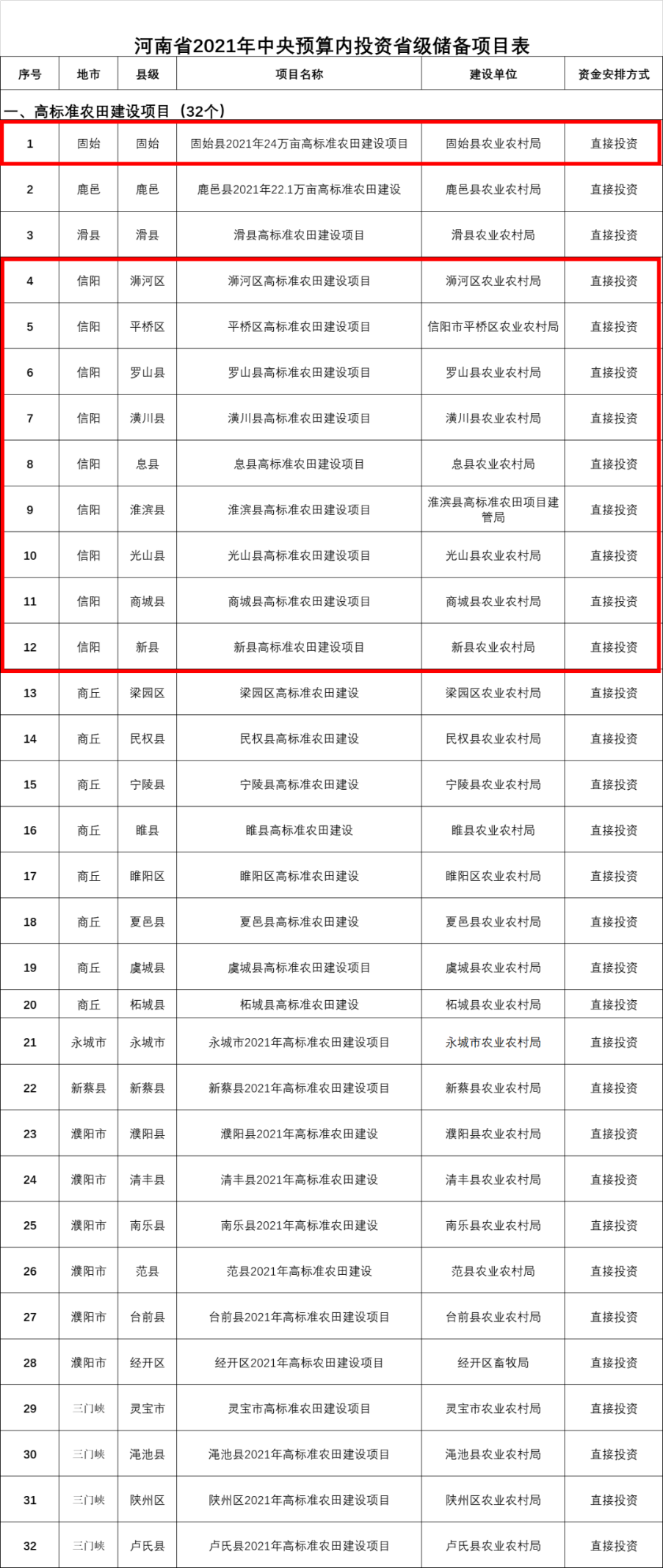 根据《农业农村部计划财务司关于做好2021年中央预算内投资部分农业建设项目前期工作的通知》(农计财便函〔2020〕230号)、《关于做好2021年中央预算内投资部分农业建设项目前期工作的补充通知》(农计财便函〔2020〕264号)、《关于做好2021年数字农业应用推广基地建设项目前期工作的通知》(农计财便函〔2020〕326号)和《河南省农业农村厅 河南省发展和改革委员会关于做好2021年中央预算内投资农业建设项目储备工作的通知》(豫农文〔2020〕238号)要求,经审查,拟将固始县2021年24万亩高标准农田建设项目等55个项目列入省级储备库。现将有关情况予以公示。如有异议,请向省农业农村厅反馈。