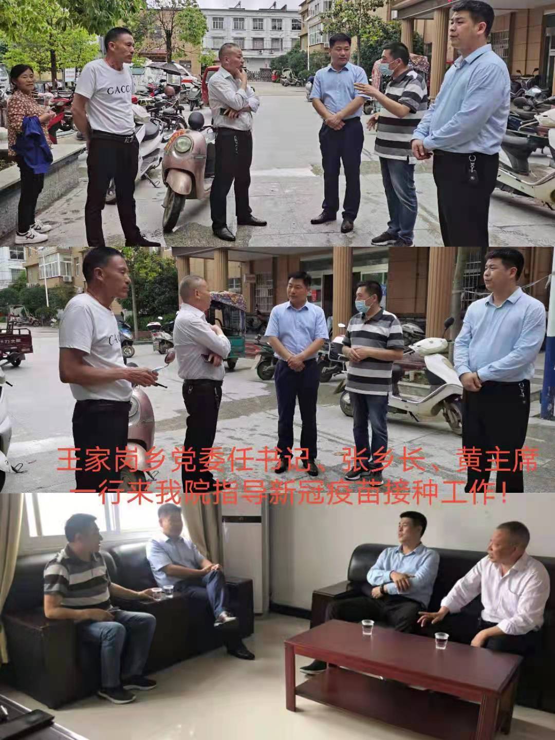 为推动疫苗接种工作5月14日上午王家岗乡党委书记任鹏 、乡长张显坤、人大主席黄国栋一行冒雨到乡卫生院检查、指导新冠疫苗接种工作。