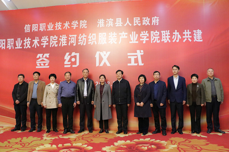 3月10日下午,信阳职业技术学院与淮滨县人民政府在淮滨县淮河饭店四楼会议室,成功举行信阳职业技术学院淮河纺织服装产业学院联办共建签约仪式。淮滨县委副书记、县长谷光亚与信阳职业技术学院校长郑云在签约仪式上先后致辞。淮滨县委常委、组长部长丁春雷,县人大常委会副主任张俊,副县长王廷俊,县政协副主席侯国清;信阳职业技术学院副校长王豪、郑延芳,学院发展规划处处长李培启、教务处处长余磊、招生办主任蔡丽、校长办公室副主任项臻出席签约仪式。