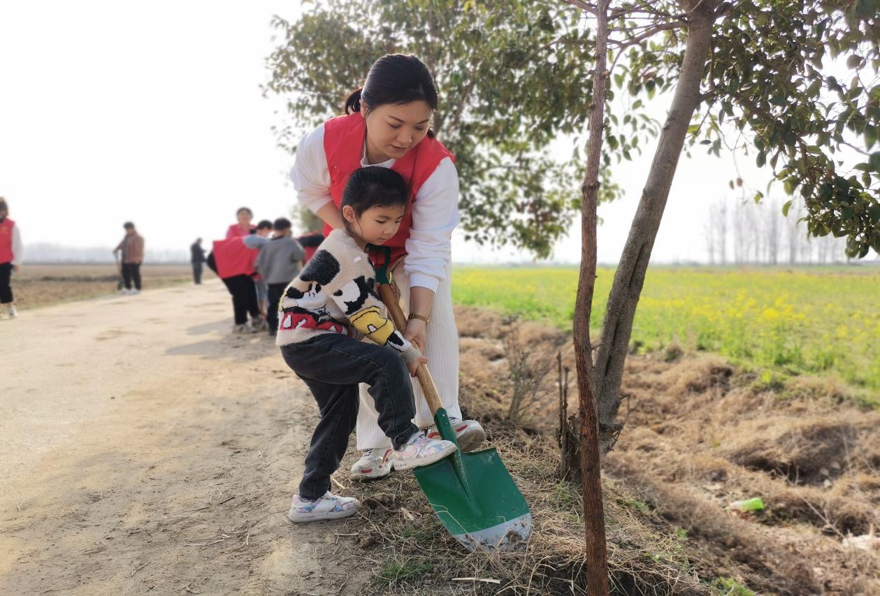 “我们一起把小树苗放到挖好的树坑里,然后给它培土、浇水……等来年你再来看望的时候,它就已经长大啦!”在王家岗乡浅孜村的一条小路旁,一位小朋友正兴高采烈地跟妈妈一起,手拿铁锹,一点一点给刚栽种的落羽杉幼苗培土。