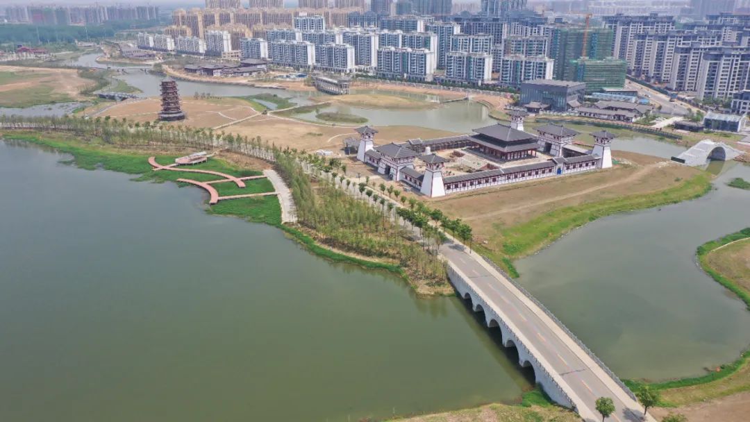 该项目主要是通过挖洼填高形成文化场馆面积、水体面积、商住面积各占1500亩的区域,概算投资10.6亿元。项目秉承“梳文”、“理水”、“建园”、“造市”的设计策略,因地制宜、因勢利导,按照淮河走势和流域形状,在原有河道上进行清理形成浓缩版“小淮河”;同时建有淮河流经的南阳、信阳、阜阳、六安、蚌埠、淮南、淮安、扬州、泰州十个市的具有浓厚历史文化背景的文化场馆,从而达到“千里淮河在淮滨,一日走完千里淮河”的文化旅游体验,让广大游客尽情领略优美的淮河风光和灿烂的淮河文化。总体上建筑风格是从汉代到清代古建样式,21座文化桥按照隋、唐、宋、元、明、清桥的特色修建,打造一个集水利、旅游、文化、宜居于一体的城市自然生态休闲区。