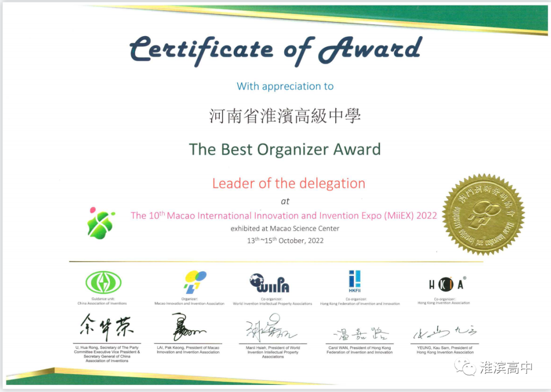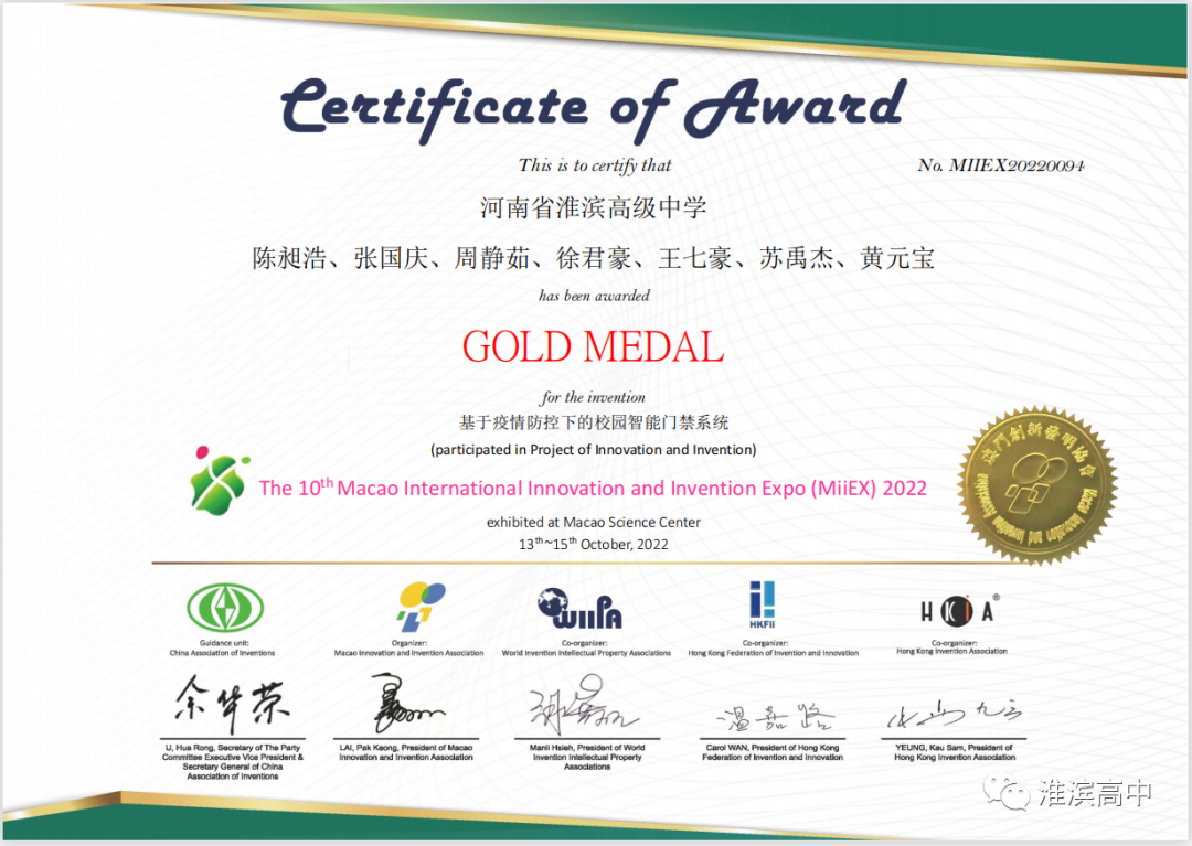 56金35银35铜!在刚结束的第十届澳门国际创新发明展中,淮滨高中学子强势摘金夺银,再次迎来淮滨高中创新教育的丰硕成果。我校《智能网课学习助手》、《基于疫情防控下的校园智能门禁系统》等18项学生作品从多个国家和地区遴选的作品中脱颖而出,学校荣获“优秀组织奖”,夏林林、马忠清、张唱、孙耀虎四位老师获得“优秀指导教师”荣誉称号。