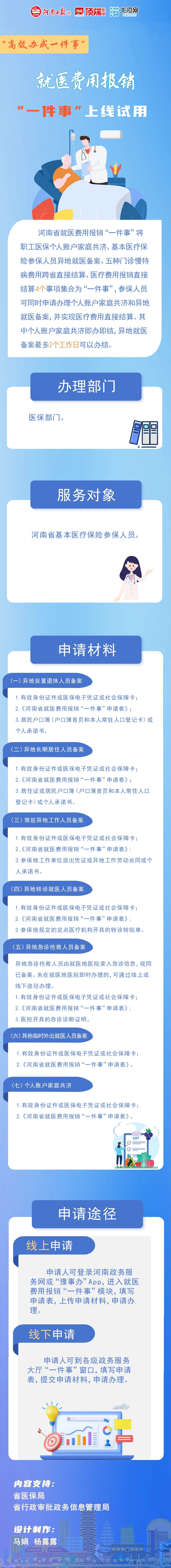 就医费用报销“一件事”是国务院办公厅部署的2024年第二批“高效办成一件事”重点事项之一。近日,河南省就医费用报销“一件事”上线,将职工医保个人账户家庭共济办理、基本医疗保险参保人员异地就医备案、五种门诊慢特病费用跨省直接结算、医疗费用报销直接结算4个“单事项”集合成为“高效办成一件事”套餐,用“数据多跑路”实现“群众少跑腿”,有效解决群众看病就医的后顾之忧。