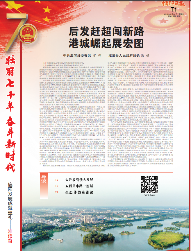 新中国成立70年以来,特别是淮滨建县67年来,在中央和省委、市委的坚强领导下,勤劳质朴的淮滨人民锐意进取,艰苦奋斗,实干拼创,奋力赶超。进入新时代,全县上下始终坚持以习近平新时代中国特色社会主义思想为指引,增强“四个意识”、坚定“四个自信”、做到“两个维护”,干在实处,走在前列,经济指标连续多年领跑全市,县域经济排名从“十一五”末的全省倒数第一跃升到2017年全省158个县区第52位,闯出一条后发地区弯道超车、跨越崛起的新路,实现了“水患大县”的美丽蝶变,“洪水走廊”的成功突围。