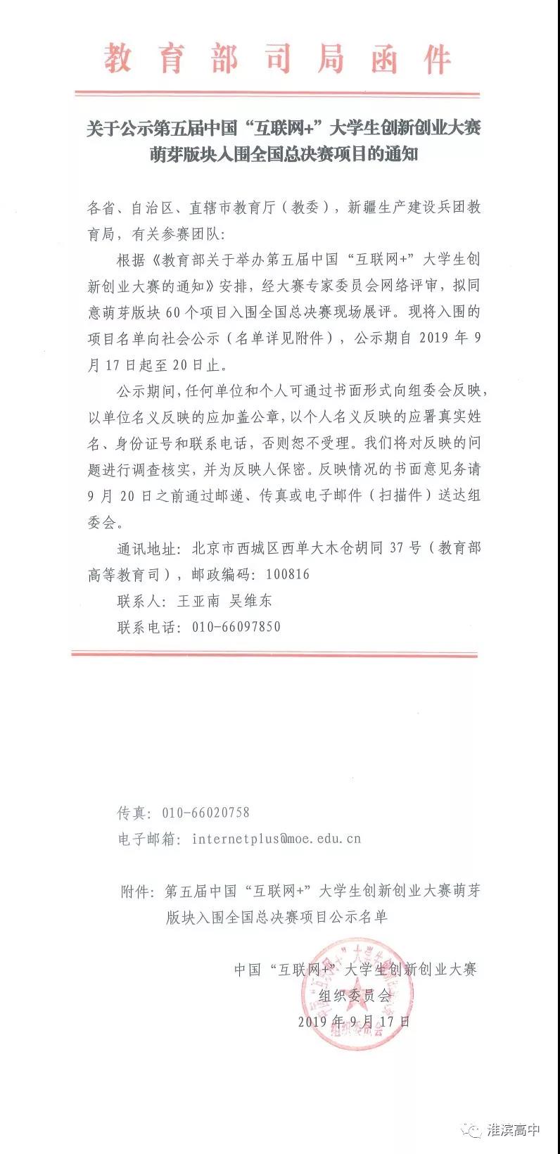 中国“互联网+”大学生创新创业大赛是由教育部高等教育司组织开展的创新竞赛活动,旨在贯彻落实全国教育大会精神,加快培养创新创业人才,持续激发学生创新创业热情,展示创新创业教育成果。2019年第五届中国“互联网+”大学生创新创业大赛增设萌芽版块,淮滨高中接到参赛通知后积极备赛,从学校创客团队多个创新创意项目中选拔2个项目参赛。经过激烈的角逐,大赛全国组委会评选出60个项目参加本次大赛的全国总决赛,最终淮滨高中申报的其中一个项目入围全国总决赛。