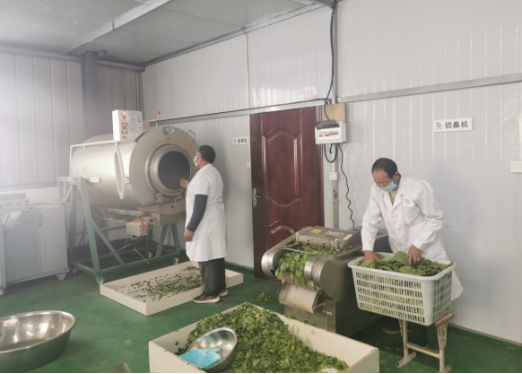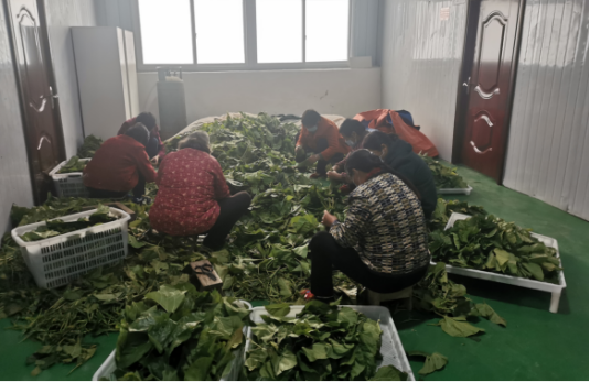 走进小集村金淮桑蚕专业合作社加工车间,我们看到十多位当地村民被分成两组,一组剪桑叶,另一组正在烘烤炒制桑叶茶,一派繁忙……