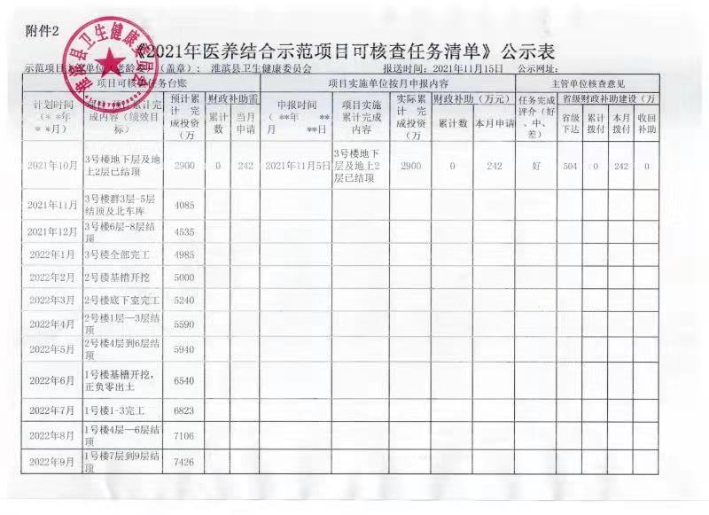 淮滨县卫生健康委员会《2021年医养结合示范项目可核查任务清单》公示表