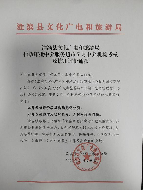 淮滨县文化广电和旅游局行政审批中介服务超市7 月中介机构考核及信用评价通报