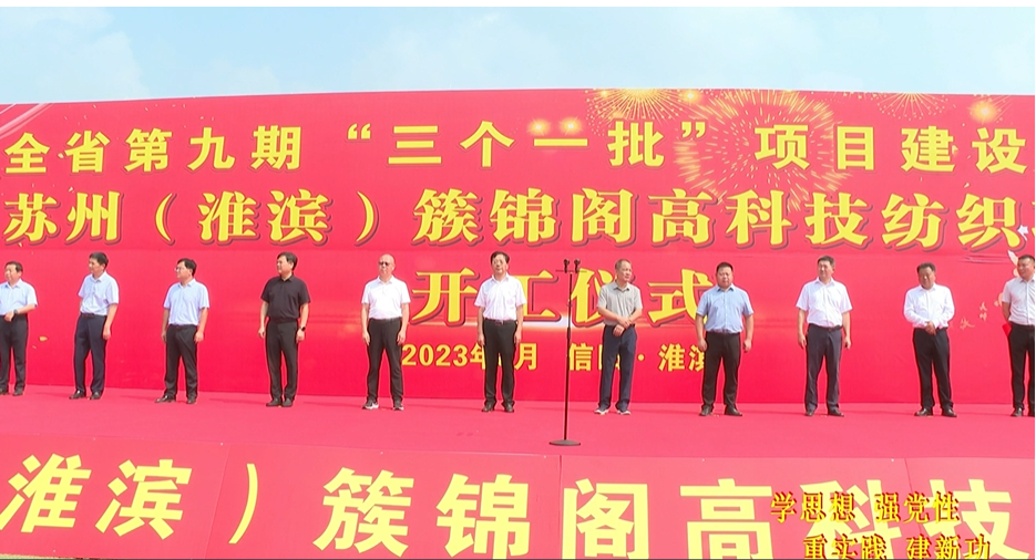 我县与全省同步举行第九期“三个一批”项目建设活动,县委书记、县长谷光亚等在家的县处级领导在淮滨分会场参加活动。谷光亚等领导前往我县集中开工一批项目建设现场,参加苏州(淮滨)簇锦阁高科技纺织项目开工活动。