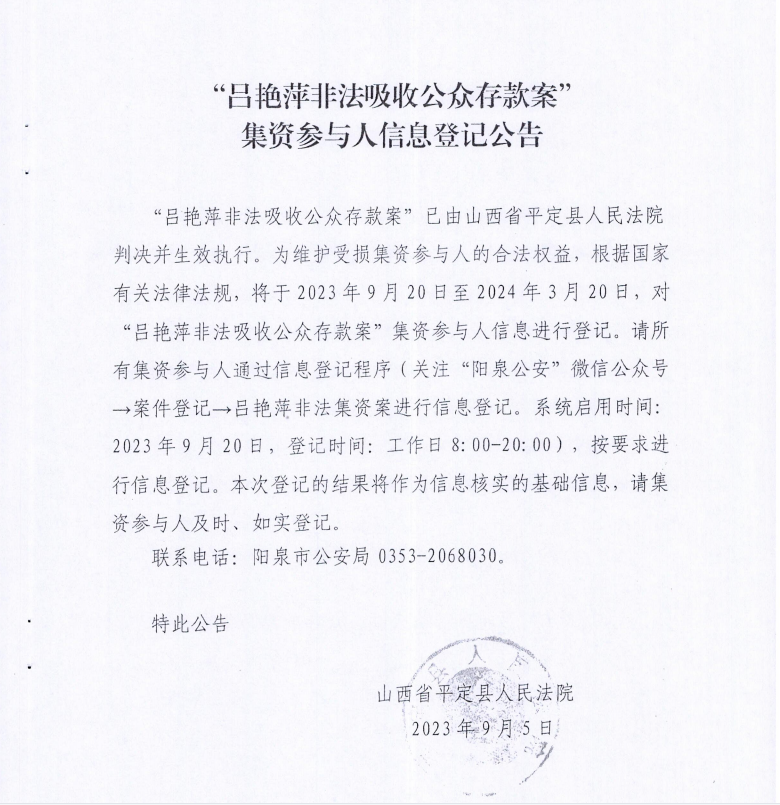 “吕艳萍非法吸收公众存款案”集资参与人信息登记公告
