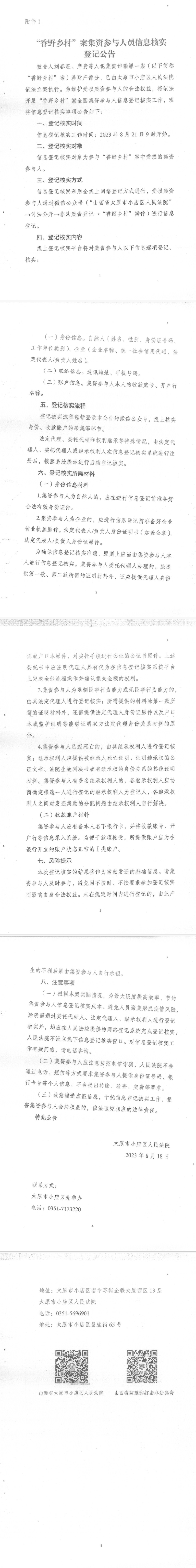“香野乡村”案集资参与人员信息核实登记公告