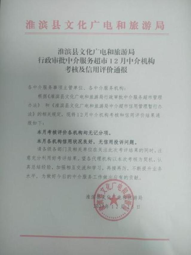 文广旅局行政审批服务超市12月中介机构考核及信用评价通报