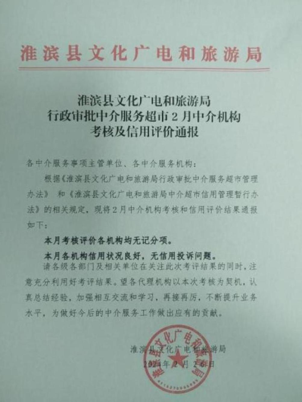 淮滨县文化广电和旅游局行政审批中介服务超市2月中介机构考核及信用评价通报