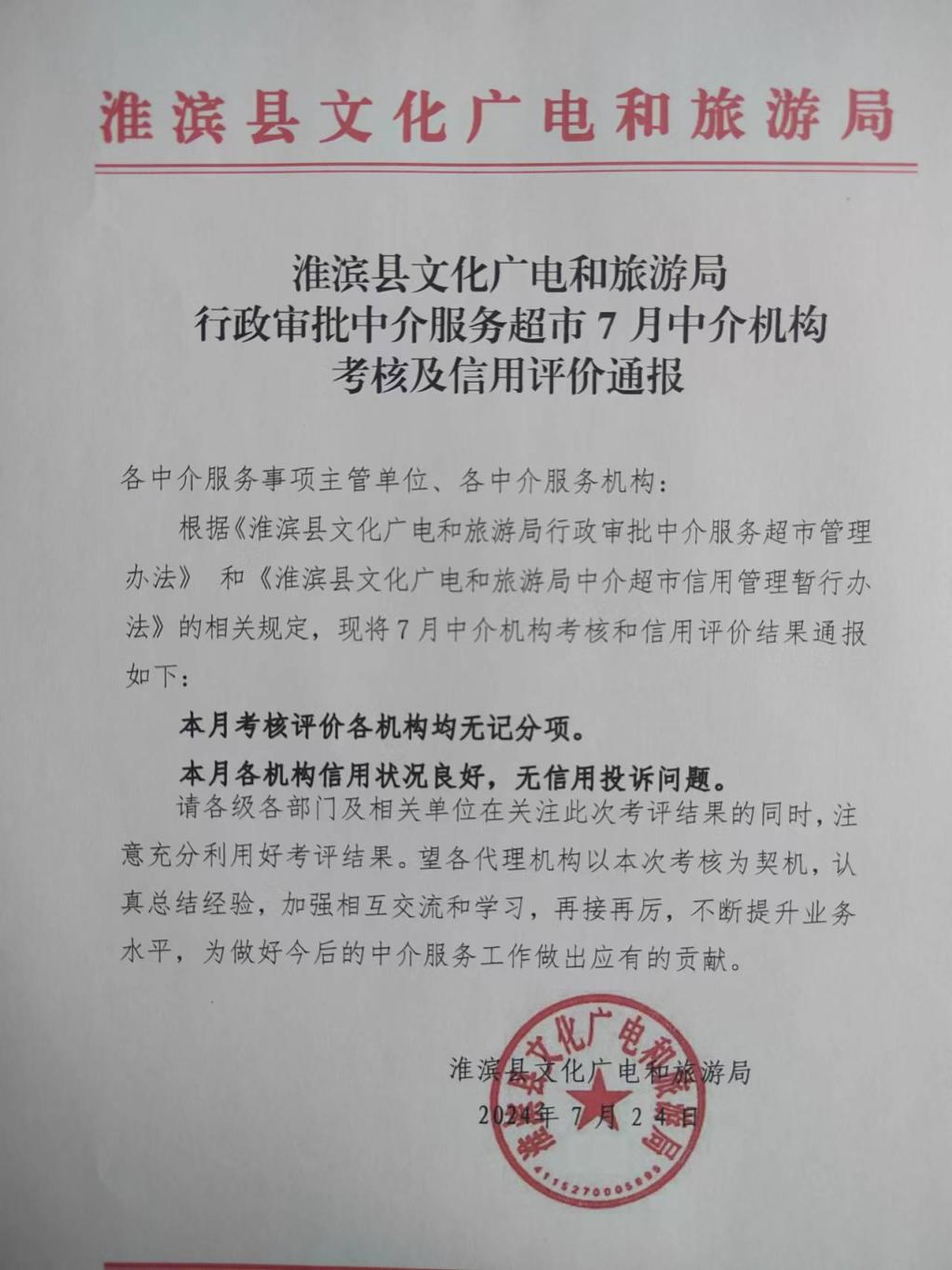 淮滨县文化广电和旅游局行政审批中介服务超市7月中介机构考核及信用评价通报
