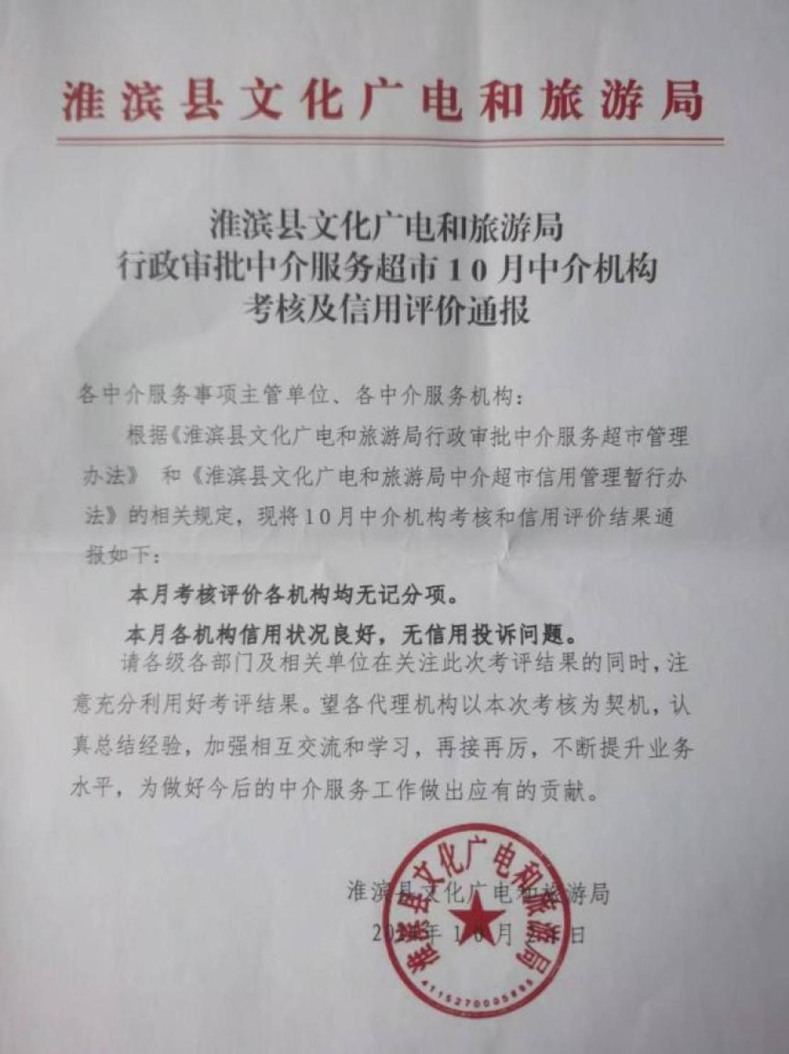 淮滨县文化广电和旅游局行政审批中介服务超市10月中介机构考核及信用评价通报