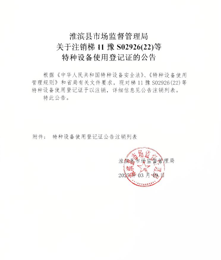 淮滨县市场监督管理局关于注销梯11豫S02926(22)等特种设备使用登记证的公告