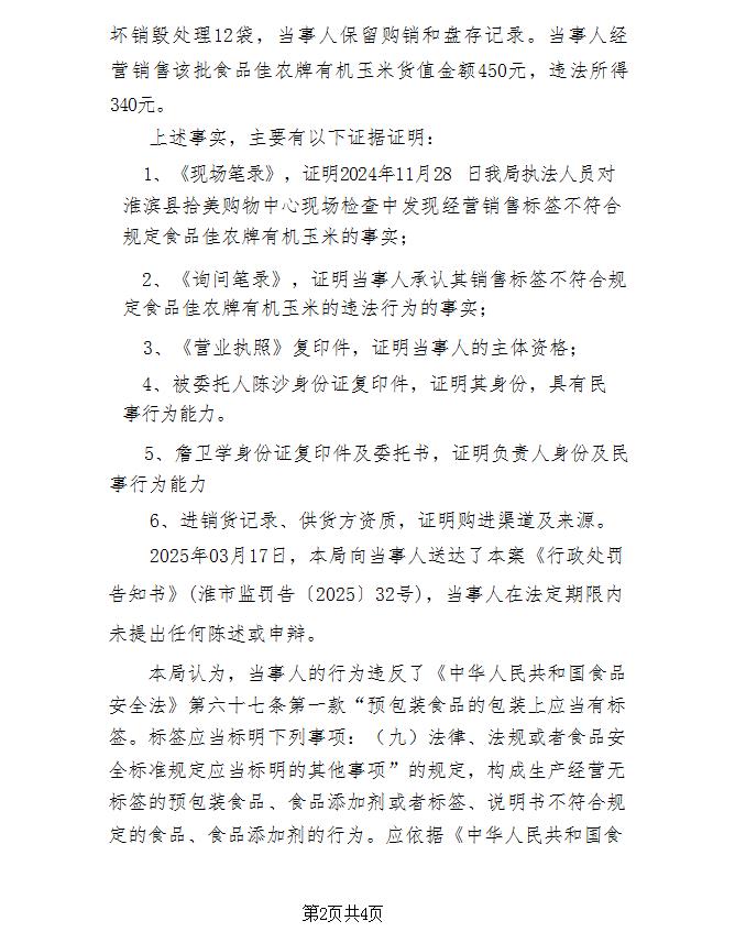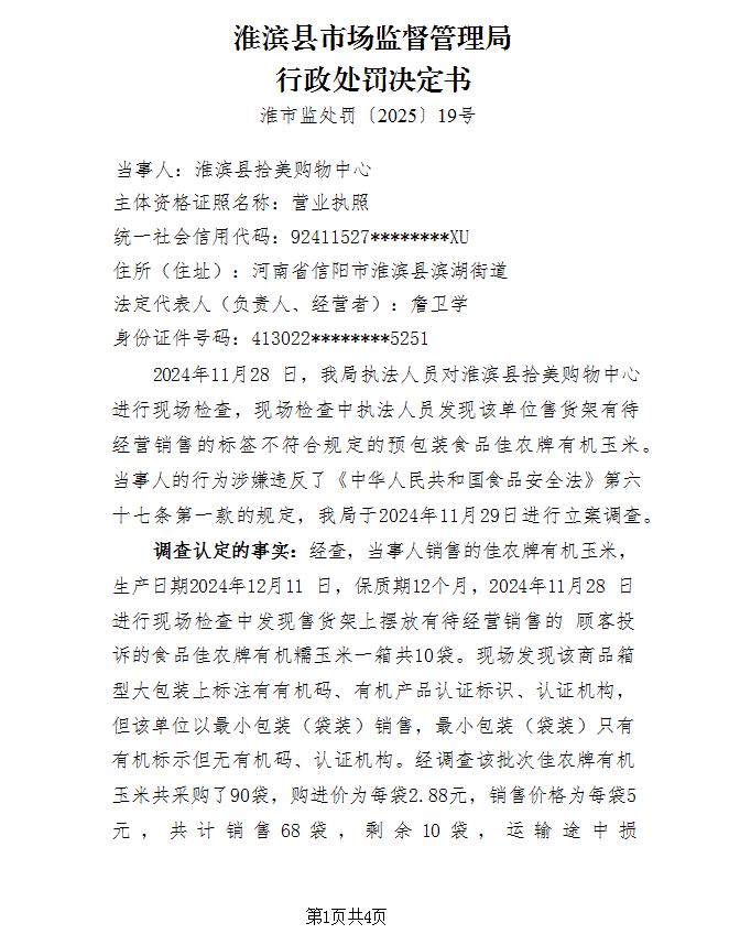 淮滨县市场监督管理局关于对淮滨县拾美购物中心行政处罚的公示