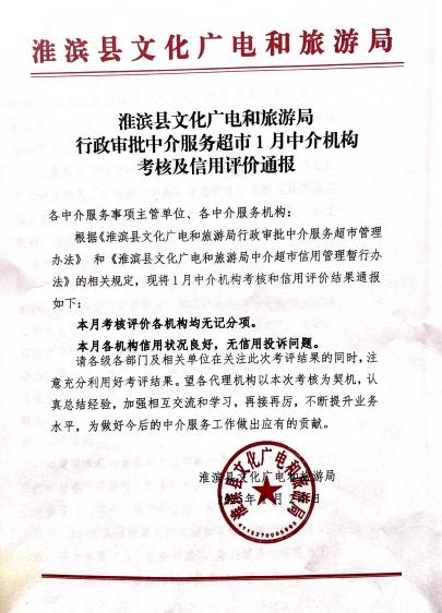 淮滨县文化广电和旅游局行政审批中介服务超市1月中介机构考核及信用评价通报