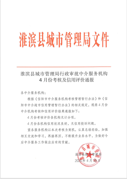 淮滨县城市管理局行政审批中介服务机构4月份考核及信用评价通报