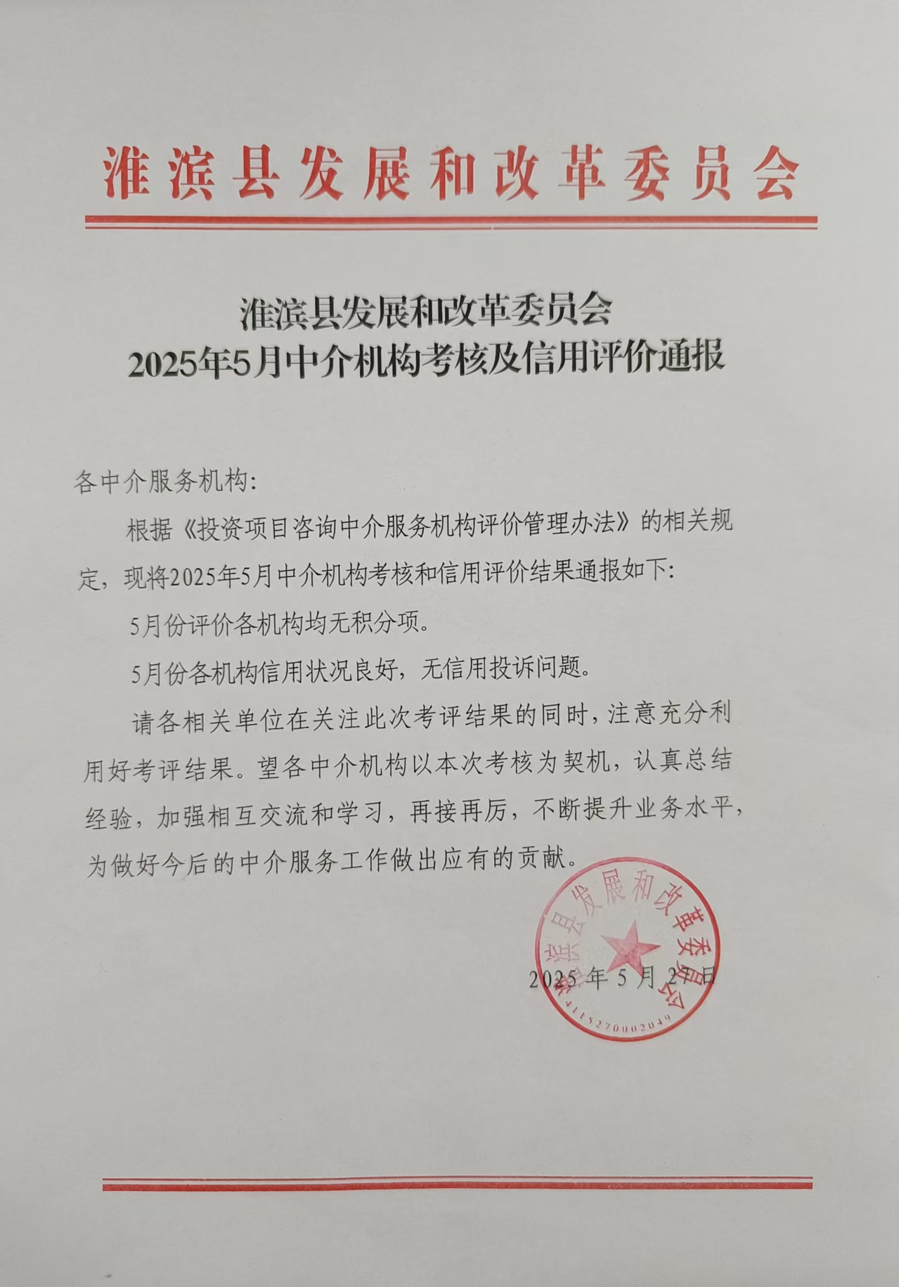 淮滨县发展和改革委员会2025年5月中介机构考核及信用评价通报