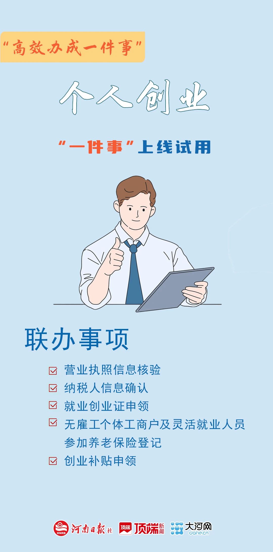 好消息!河南的创业者们,你们的“创业大礼包”来啦!近日,从省行政审批政务信息管理局了解到,河南省个人创业“一件事”上线试用,将个人创业相关的就业创业证申领、创业补贴申领等5个跨部门政务服务事项进行“打包”,创业人员可以“一表申请”、一站办理,享受这份“保姆级”服务,轻松开启创业梦想!