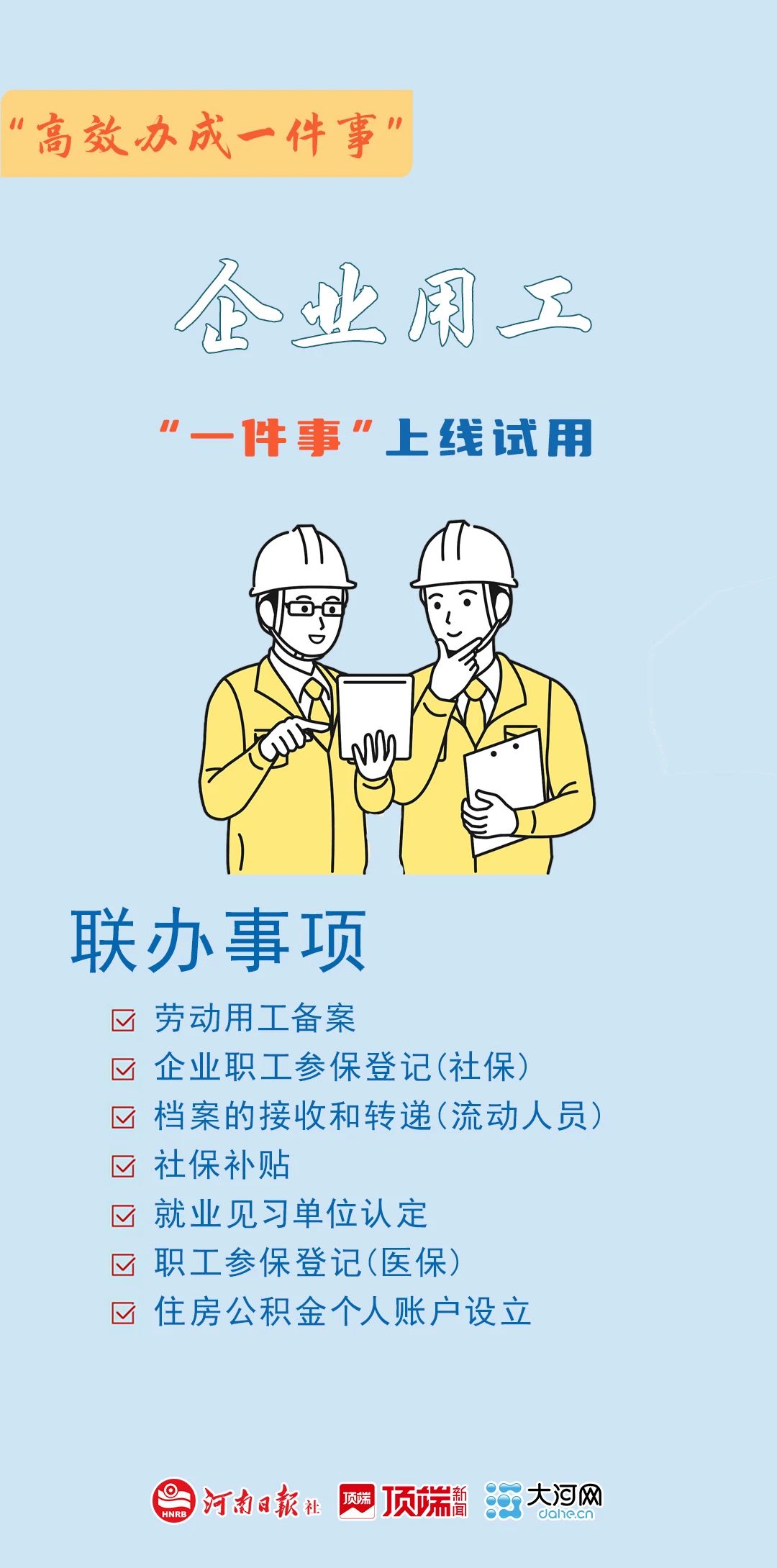 为切实解决企业群众“多头跑、材料繁”的痛点,持续优化营商环境,近日,人社、住建、医保等部门通过整合跨部门业务,推出河南省企业用工“一件事”。企业用工“一件事”实现劳动用工备案、企业职工参保登记(社保)、档案的接收和转递(流动人员)、社保补贴、就业见习单位认定、职工参保登记(医保)、住房公积金个人账户设立等7个事项集成办理,从“多头跑、多次办”变为“一次告知、一表申请、一套材料”,企业办事效率大幅提升。