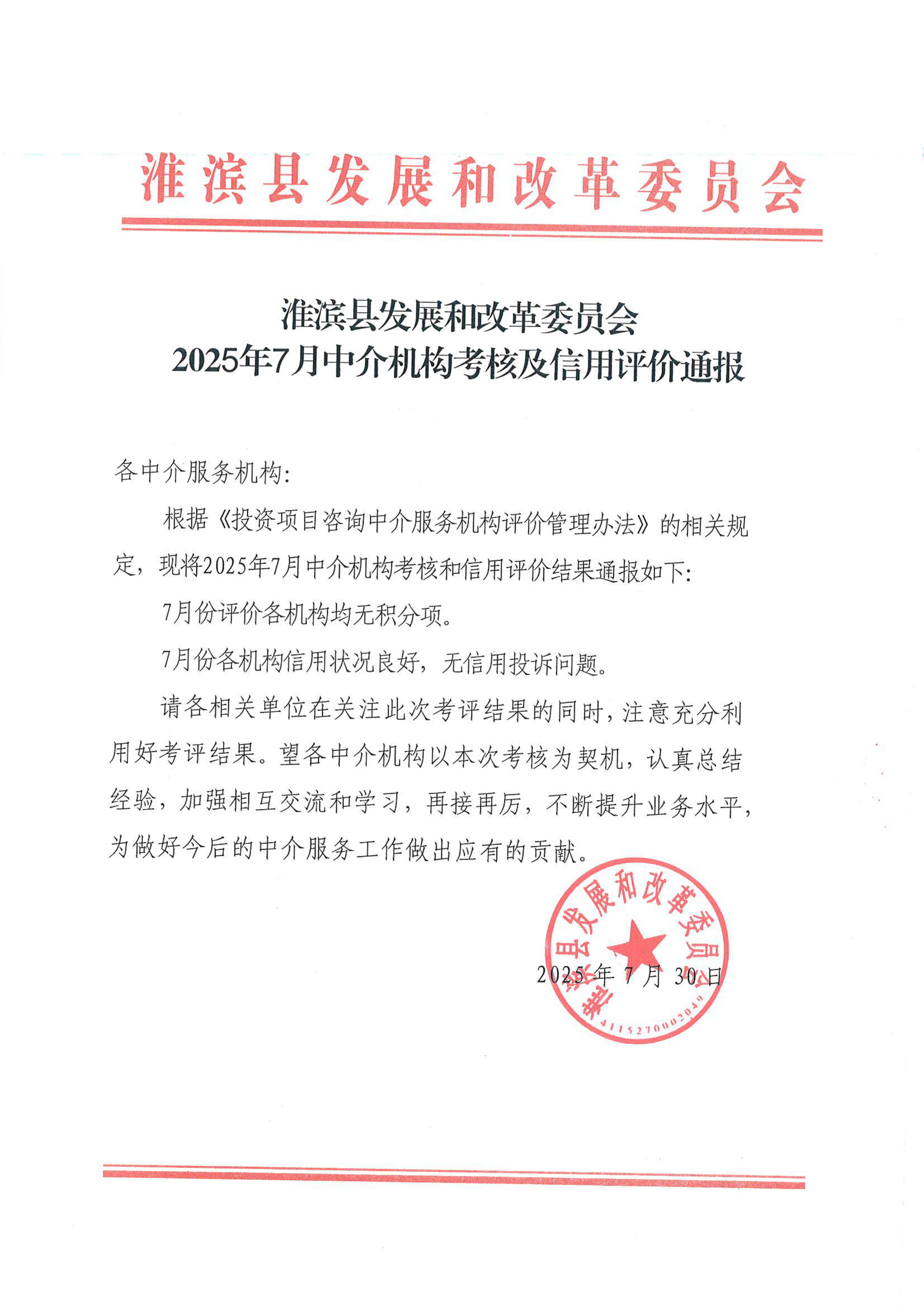 淮滨县发展和改革委员会2025年7月中介机构考核及信用评价通报